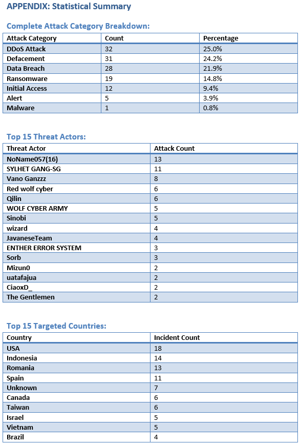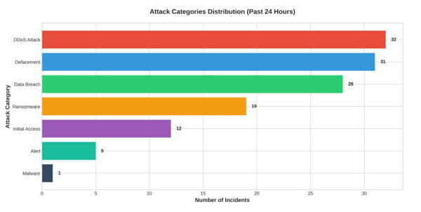 The dominant attack vectors were DDoS attacks (32 incidents, 25.0%), website defacements (31 incidents, 24.2%), and data breaches (28 incidents, 21.9%). Ransomware operations maintained significant activity with 19 confirmed incidents.