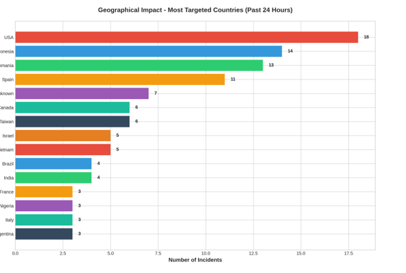Indonesia experienced 14 incidents, primarily consisting of website defacements targeting educational and governmental websites. This activity reflects regional hacktivist operations and potentially nationalist cyber actors.