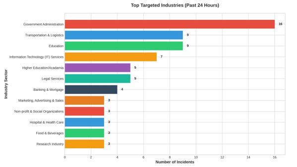 Government Administration emerged as the primary target with 16 incidents, representing sustained adversary interest in disrupting public services and accessing sensitive governmental data. This targeting includes customs services, immigration systems, and municipal infrastructure.